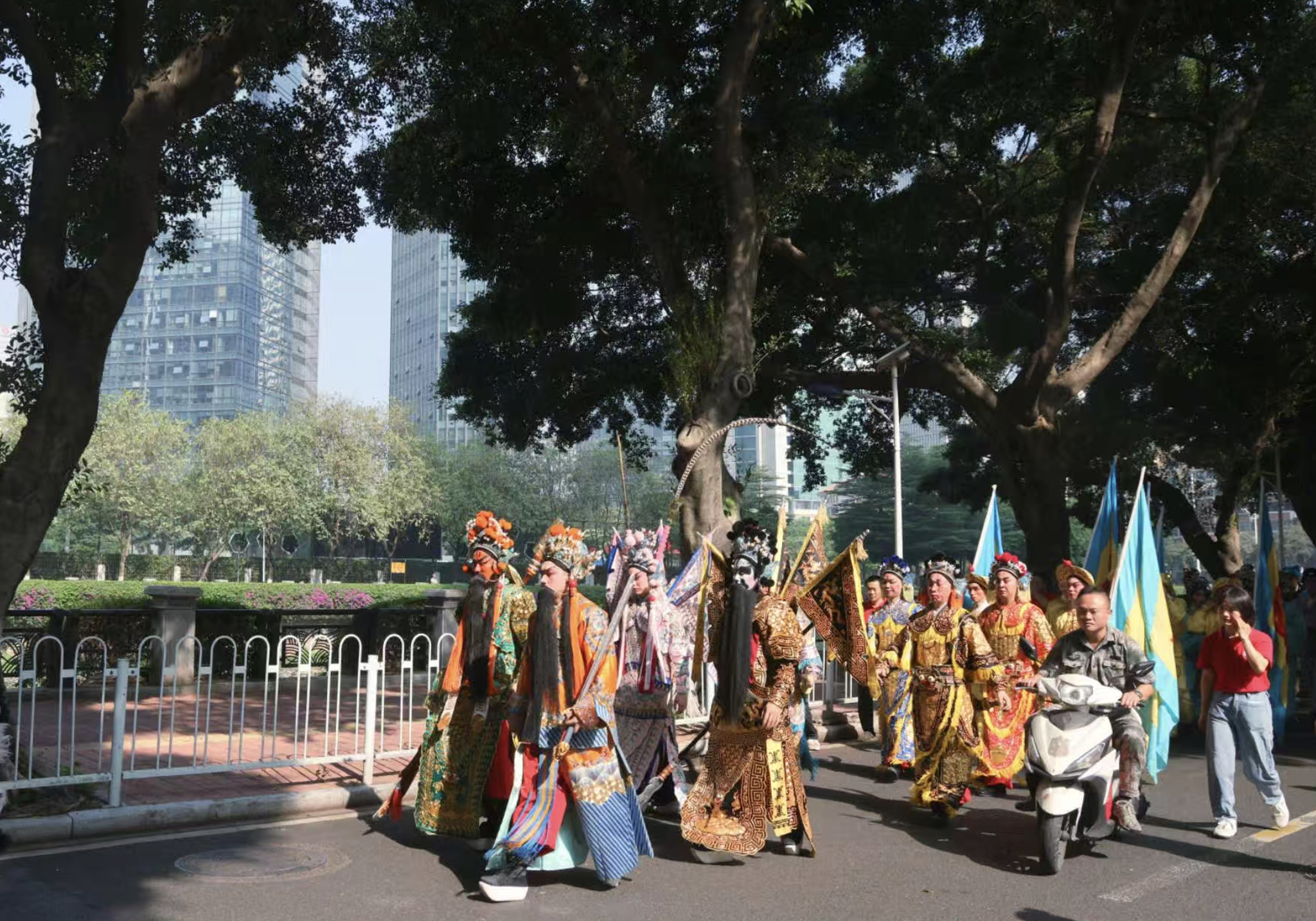 粤剧、非遗木偶等特色方阵接连亮相。石牌小学粤剧艺术社“小戏骨”盛装出演,唱腔稚嫩却饱含热忱;广州粤剧院专业演员助阵,英雄、八仙方阵增添传统祥瑞氛围;广东省木偶艺术剧院带来穆桂英、孙悟空、花木兰等经典木偶表演,精巧灵动、妙趣横生,充分展现岭南非遗艺术魅力。